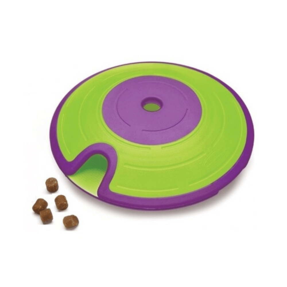 El dispensador dog treat maze de Nina Ottosson es un rompecabezas para perros dispensador de golosinas, libera golosina desde 2 puntos de entrada, uno de cada lado del platillo.